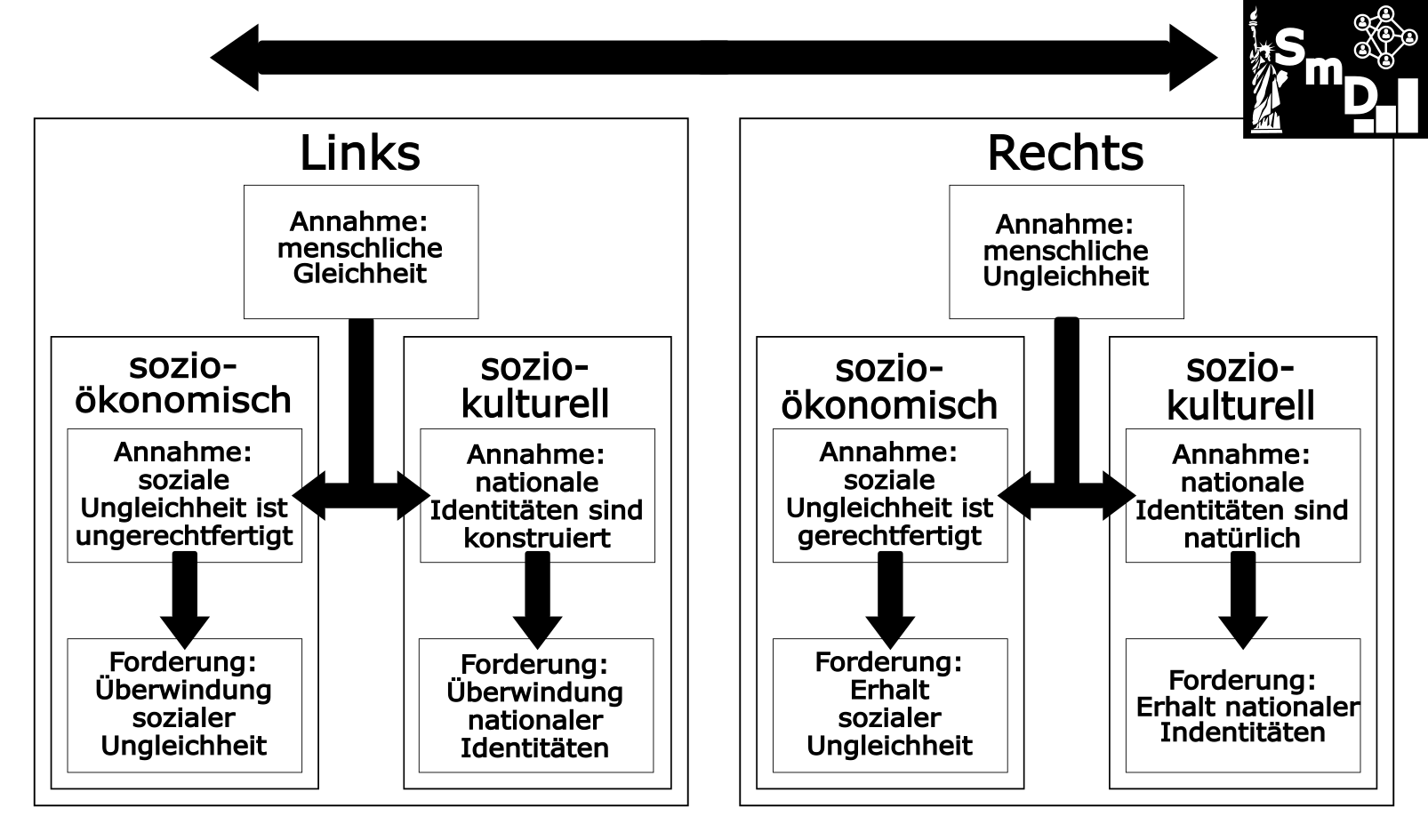 Von dieser Annahme menschlicher Gleichheit (links) bzw. Ungleichheit (rechts) leiten sich dann wiederum alle anderen Annahmen, Bewertungen von Forderungen ab, in denen sich Links und Rechts tendenziell unterscheiden, wie etwa die thematisierte Betrachtung von sozialen Ungleichheiten als ungerecht bzw. gerecht sowie von kulturellen Unterschieden als überwind- bzw. unüberbrückbar (siehe Schaubild 1).