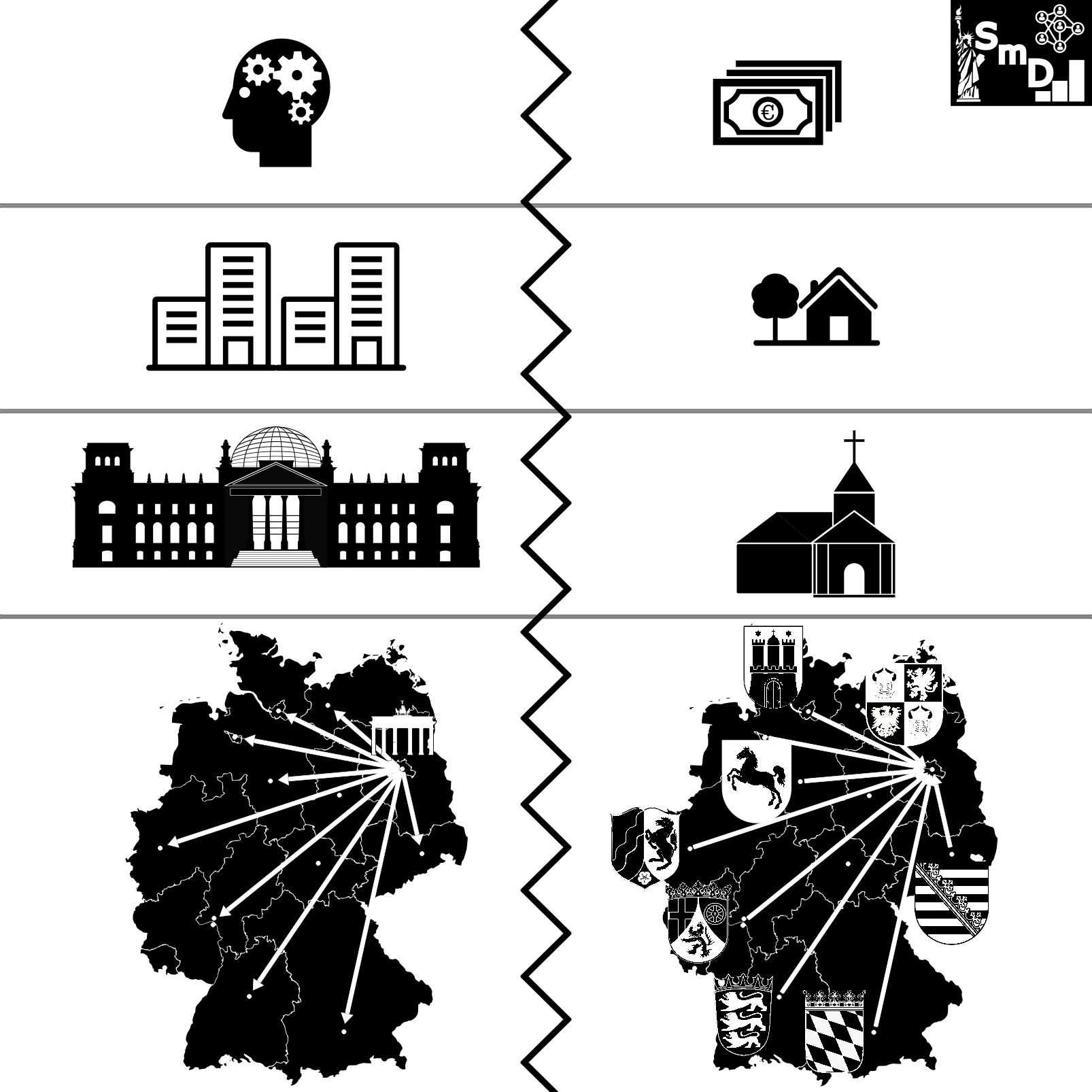 Zwar mag es sein, dass wir etwa beobachten können, dass linke politische Akteure sich häufiger für die Interessen der Stadt- und rechte politische Akteure sich häufiger für die Interessen der Landbevölkerung einsetzen, sowie rechte politischer Akteure sich eher für den Erhalt von Privilegien der Kirche und Befugnissen der Bundesländer einsetzen.